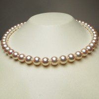 目に飛び込んでくる輝きと、しっとり感のクリームピンクの色目が強くでたネックレスです。よく見ないと分からない程度のキズも最上級の艶が目立たなくしてくれるお値打ちなお品、色・艶を重視したネックレスです。ピンクの色に輝きが強調されて華やかさを際立たせる逸品です。存在感のある8mm珠です。首元から胸元にかけて8mmから9mmまでの真珠を使っており、着けた時に圧迫感がなく綺麗なラインに仕上がります。